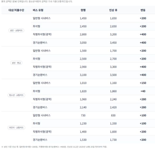 현금 기준으로는 일반형 1500원에서 1700원, 좌석형 2500원에서 2700원, 직행좌석형 2900원에서 3300원, 경기순환버스 3100원에서 3500원으로 각각 이상된다.