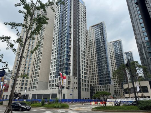 단지 전반은 공사가 상당 부분 진행됐다. 14층 높이에서 근로자가 외관 작업을 이어가고 있었고, 일부 동은 붉은색 방진망에 둘러싸여 공사가 한창이었다. 현장 곳곳에는 안전수칙을 강조하는 현수막이 내걸려 있었다. 근로자들은 안전모를 쓴 채 분주히 움직였고, 관리자의 신호에 따라 레미콘 차량이 드나드는 모습도 볼 수 있었다.