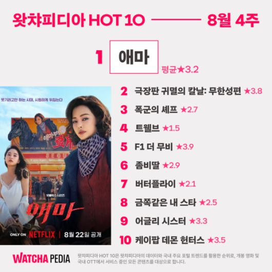 마지막 9위는 20일 개봉한 영화 '어글리 시스터', 10위는 넷플릭스 애니메이션 영화 '케이팝 데몬 헌터스'에게 돌아갔다. '케이팝 데몬 헌터스'는 6월 4주차부터 이번 8월 4주차까지 무려 10주째 차트인에 성공해 왓챠피디아 HOT 10 최초로 10주 연속 진입이라는 기록을 세웠다.