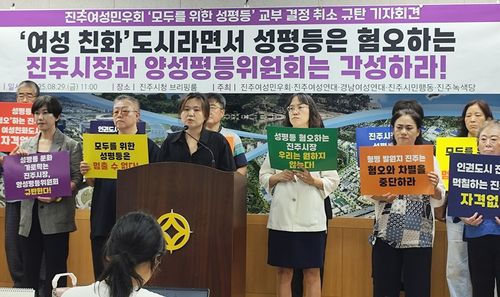 (진주=연합뉴스) 정종호 기자 = 경남 진주시가 성에 대한 편향된 가치관을 퍼트린다며 지역 여성단체의 성평등 강좌에 대한 지원을 취소하기로 하자 주최 측이 반발하고 나섰다.