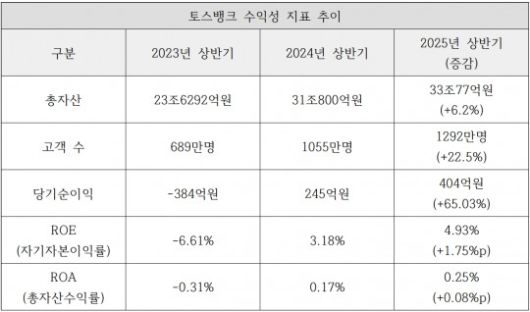 29일 토스뱅크가 발표한 2025년 상반기 실적에 따르면 토스뱅크의 상반기 당기순이익은 404억원으로 전년 동기(245억원) 대비 65.03% 증가했다. 불과 2년 전 384억원 적자에서 빠르게 흑자 전환에 성공하며 성장 속도를 높이고 있다.