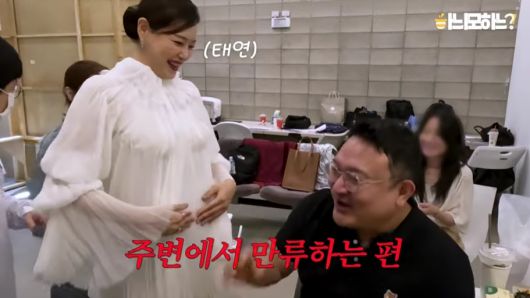 여기서 그치지 않고 이하늬는 직접 감독의 손을 자신의 배에 갖다 댔다. 이하늬는 "배가 땅땅하다"며 "얘가 차서 잠을 못잔다. 파이팅이 넘친다. 보통 아니다"라고 고개를 내저었다.