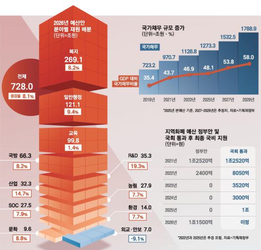 지역 균형·복지 확충·친노동 등 이 대통령이 강조한 사업 예산도 대거 포함됐다. 지역사랑상품권(지역화폐) 예산은 윤석열 정부 때 한 푼도 담기지 않았지만 이번엔 1조1500억원이 책정됐다. 정부는 내년에 24조원의 지역화폐를 발행할 계획이다.