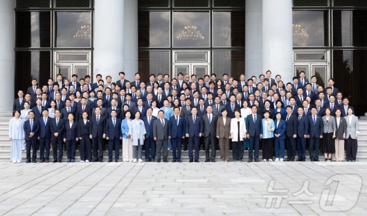 이재명 대통령이 29일 청와대 영빈관에서 열린 더불어민주당 의원 초청 오찬 간담회를 마친 후 참석 의원들과 기념촬영을 하고 있다. (대통령실 제공. 재판매 및 DB 금지) 2025.8.29/뉴스1 ⓒ News1 이재명 기자 |