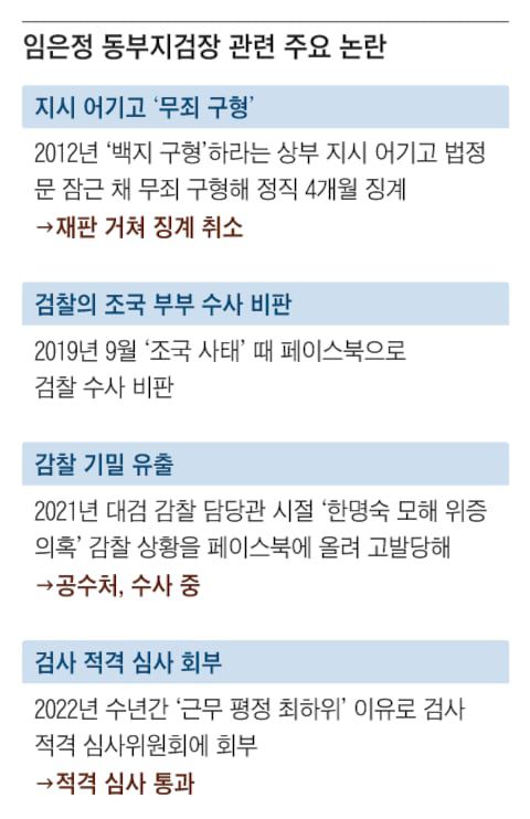 임 검사장은 2007년 이른바 ‘도가니 사건’으로 불린 광주 인화학교 장애 아동 성폭력 사건의 공판 검사를 맡으면서 이름을 알렸다. 2012년 12월 반공법 위반 재심 사건에서 다른 검사에게 사건을 넘기라는 상부 지시를 어기고 법정 문을 걸어 잠근 채 무죄를 구형했다가 정직 4개월 징계를 받았다. 당시 임 검사장이 이른바 ‘백지 구형’ 지시를 이행하지 않자 검찰 지휘부가 사건을 다른 검사에게 재배당했는데, 임 검사장이 이를 거부한 것이다.