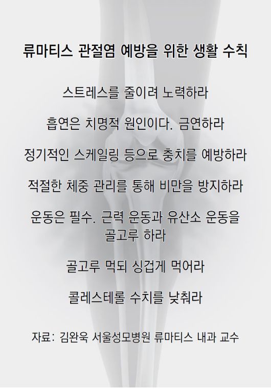 첫째가 스트레스다. 스트레스는 만병의 근원이자 면역 체계를 교란하는 주범이다. 의도적으로라도 스트레스를 줄이려 노력해야 한다. 둘째, 흡연이다. 최근 연구 결과 담배를 피우면 류마티스 관절염 발병 위험이 3배 이상으로 뛰었다. 류마티스 유전자가 있는 사람이 흡연한다면 이 확률은 20배 이상으로 늘어났다. 금연은 필수다.