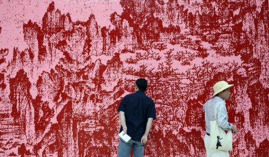 수묵의 현대화를 표현한 대표적인 작품은 황인기의 ‘오래된 바람’이다. 화가 안견의 ‘몽유도원도’를 레고 조각으로 형상화했다. 320X896㎝ 크기의 작품은 검은색 먹 대신 붉은색과 분홍색의 레고 블록을 붙여 독특한 형태로 수묵을 표현했다.