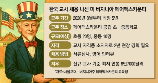 이번 채용은 페어팩스카운티 교육청이 교사 부족 문제를 해결하기 위해 2023년 도입한 ‘앰배서더 티처 프로그램(Ambassador Teacher Program)’과 연계된다. 미국 외 영어권 교사를 채용해 지역 내 공립학교에 배치하는 프로그램으로, 지난해 시범사업 형태로 한국 초등교사 10명을 선발한 바 있다. 현지 교육청은 한국 교사들이 전문성과 교실 운영 역량 등 측면에서 특히 우수하다고 평가해 올해부터 한국 초·중등 교사 채용을 본격 확대하겠다는 뜻을 서울교대 측에 전했다.