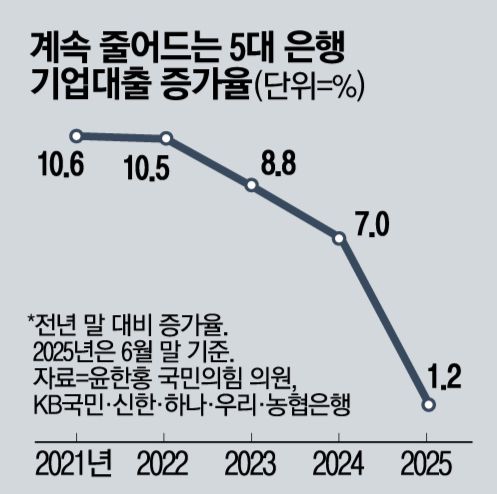 29일 매일경제가 국회 정무위원장인 윤한홍 국민의힘 의원을 통해 입수한 5대 시중은행(KB국민·신한·하나·우리·NH농협은행) 신용등급별 차주 및 대출 현황 자료에 따르면 2021년과 2022년 5대 은행의 기업대출 잔액은 2년 연속 두 자릿수 증가율을 기록했지만, 2023년과 2024년엔 증가율이 각각 8.8%, 7%로 내리막을 걸었고, 올해의 경우 6월 말까지 증가율이 1.2%에 불과했다.