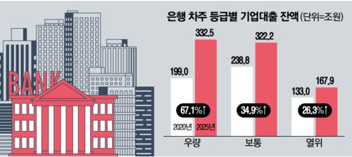 반면 일반적인 중소기업이 부여받는 ‘보통’ 등급에 속하는 경우 대출받기가 더 어려워졌다. 2020년과 2021년까지만 해도 보통 등급 기업이 받아간 대출은 전체의 40%대였지만, 2022년 이후 역시 30%대로 떨어졌다. 2020년과 2025년 6월을 비교하면 2.7%포인트나 감소했다. 신용등급이 나빠 극히 한정적으로만 대출이 나가는 ‘열위’ 등급의 경우에는 대출 비중이 5년 전과 비교해도 3%포인트 감소했다.