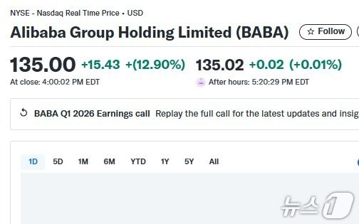 29일(현지 시각) 뉴욕증시에서 알리바바는 12.90% 폭등한 135달러를 기록했다. 알리바바는 주식예탁증서(ADR) 형태로 미국증시에 상장돼 있다.
