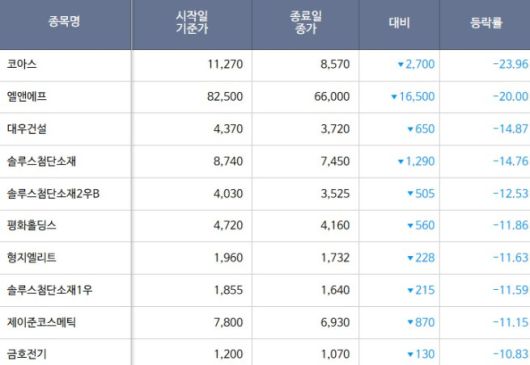 이외에도 대우건설(-14.87%), 솔루스첨단소재(-14.76%), 평화홀딩스(-11.86%), 형지엘리트(-11.63%), 제이준코스메틱(-11.15%) 등도 하락률 상위권에 이름을 올렸다.