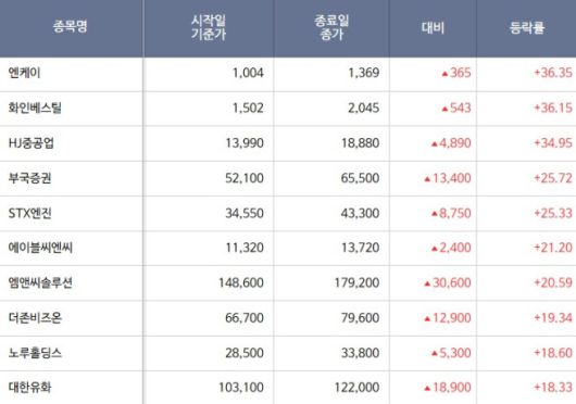 이외에도 STX엔진(25.33%), 에이블씨엔씨(21.20%), 엠앤씨솔루션(29.59%), 더존비즈온(19.34%), 노루홀딩스(18.60%), 대한유화(18.33%) 등이 강세를 보였다.