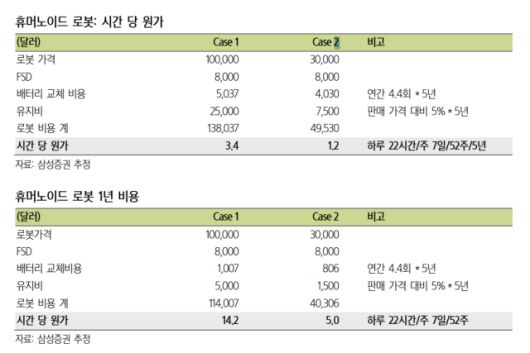 삼성증권은 올해 2월 휴머노이드 로봇을 다룬 보고서를 냈습니다. 보고서에 따르면 가격 10만 달러(약 1억 3800만원) 로봇을 5년 간 매일 22시간 공장에 투입하면 시간당 비용은 3.4달러(약 4700원)로 중국 인건비의 절반 수준입니다. 일론 머스크의 주장대로 로봇 가격이 3만 달러대로 떨어지면 어떻게 될까요. 시간당 원가는 1.2달러(약 1700원) 입니다.