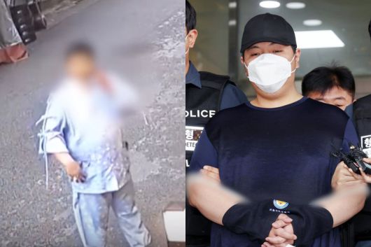 서울 강북구 미아동 마트에서 흉기를 휘둘러 1명을 살해하고 1명을 다치게 한 김성진(32)이 지난 5월1일 검찰로 구속 송치되고 있다. 왼쪽은 범행 직후 폐쇄회로(CC)TV에 포착된 김씨 모습. 연합뉴스·뉴스1 |