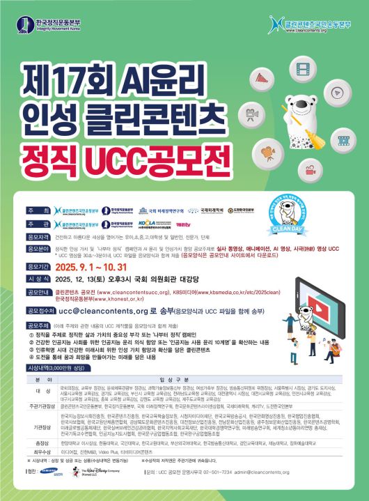 우리 삶의 전반에 혁명적인 변화를 가져온 인공지능(AI)시대에 AI 윤리와 인성의 중요성이 새로운 과제로 부각되는 가운데, 클린콘텐츠국민운동본부(회장 안종배)는 9월 1일부터 10월 31일까지 ‘제17회 AI윤리 인성 클린콘텐츠 정직 UCC 전국공모전’을 전국 최대 규모로 개최한다고 31일 밝혔다.
