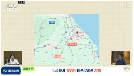 ◇ 최서윤> 맞습니다. 말씀하신 것처럼 '복합재해'가 올여름 장마의 중요한 키워드였어요. 폭염과 폭우가 번갈아 일어나는 그런 현상이에요. 복합재해 양상을 볼 때 단순히 강수량, 강우량만 볼 게 아니에요. 왜냐하면 강수량이 충분하다고 해도 이상고온 때문에 폭염이 일어나서 증발량이 많아지면 '돌발가뭄'이 나타나는 형국이라고 합니다. 강릉은 올여름 강수량도 적지만, 온도를 찾아보니까 6월부터 낮 최고 기온이 34도에 육박하는 정말 뜨거운 여름을 보내고 있더라고요. 이렇게 기후 재해는 복합적으로 작용할 수 있어요. 강릉만의 일이 아닐 수도 있는 거죠. 기후재해가 날로 심각해지는데 제대로 대비나 대응을 못 하면 인재가 발생하죠. 이번 사태에서 기후재해와 인재가 겹치면 강릉의 단수 사태, 물 부족 사태처럼 심각한 피해를 겪을 수 있다는 교훈을 취해야 할 듯해요.