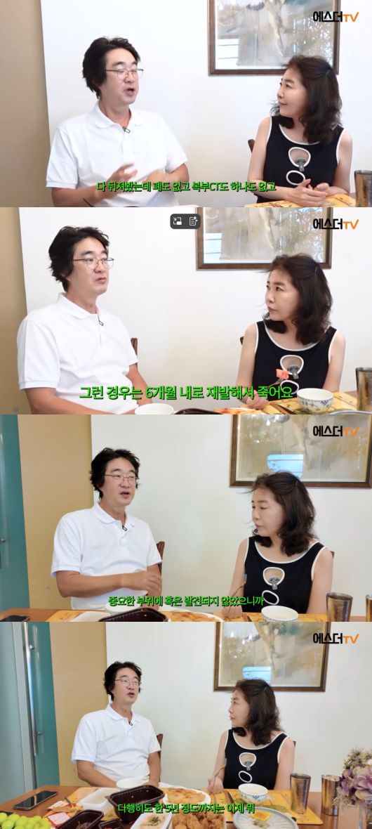 이어 "다행히도 5년 정도까지는 중요한 부위에 혹은 발견되지 않았으니까 5년까지는 무난히 살 것 같다"라며 안심했고, 여에스더는 "3년 지난 다음에 이 정도면 암이 아니어도 뭔가 결절이 있거나 그럴 수도 있는데 그것도 없고 복부에도 아무것도 없다고 하니까"라며 기뻐했다.