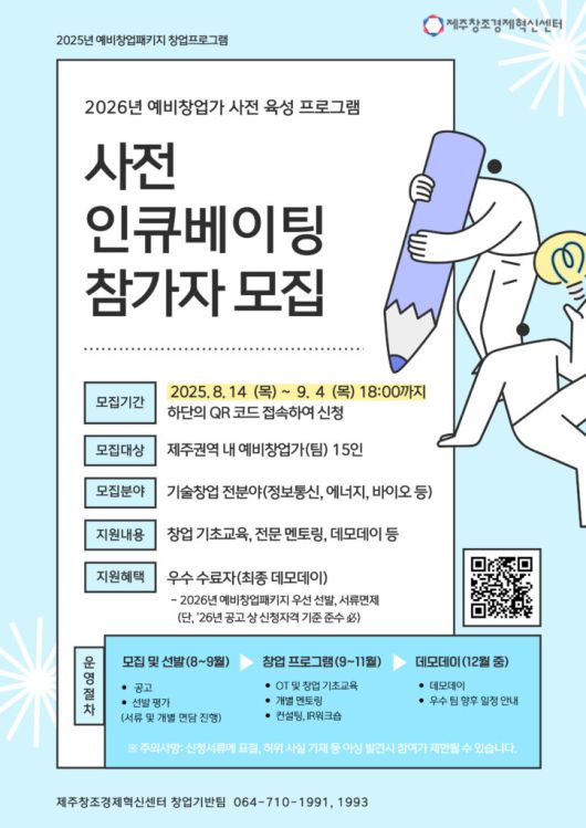 제주창조경제혁신센터가 2025년 예비창업패키지 창업프로그램의 '사전 인큐베이팅 프로그램' 참가자를 모집한다.