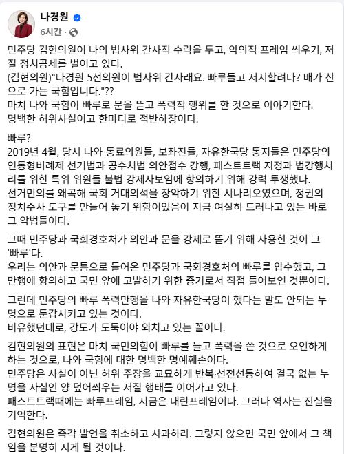 나 의원은 오늘(30일) 페이스북에 최근 김 의원의 글을 인용하며 "마치 나와 국민의힘이 빠루로 문을 뜯고 폭력적 행위를 한 것으로 이야기한다"며 "명백한 허위 사실이고 한 마디로 적반하장"이라고 반박했습니다.