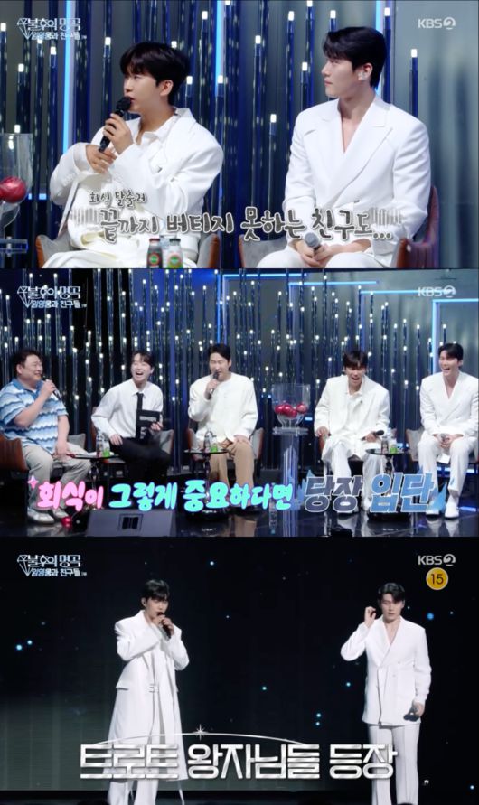 임영웅은 “가수가 되기 전에 실제 축구선수였지 않냐. 전종혁 씨가 트로트를 한다고 했을 때 저사람 무조건 데리고 와야겠다고 했다. 노래 말고 축구를 같이 하고 싶어서. 우리 팀에서 가장 중요한 게 인성인데, 테스트를 딱 해봤는데 회식에 와서 끝까지 있냐 안 있냐”고 털어놔 웃음을 자아냈다.