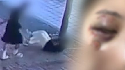 한 남성이 인도에 앉아 있는 여성의 얼굴을 발로 걷어찹니다.