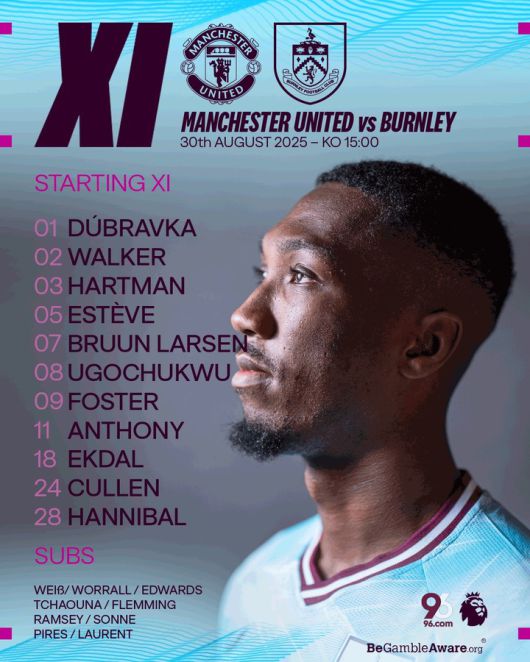 원정팀 번리는 라일 포스터와 야쿱 브룬 라르센, 한니발 메브리, 제이든 앤서니, 치무아냐 우고추쿠, 조쉬 컬렌, 퀼린치 하트만, 막심 에스테베, 얄마르 에크달, 카일 워커, 골키퍼 마르틴 두브라브카가 선발 명단에 이름을 올렸다.