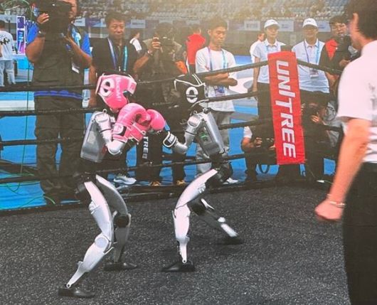 '세계 휴머노이드 로봇 운동회'가 열린 중국 베이징 국가스피드스케이팅홀 스크린에 로봇들의 킥복싱 경기가 중계되고 있다. / 연합뉴스 |