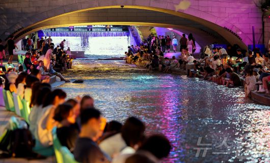 서울 중구 청계천을 찾은 시민들이 더위를 식히고 있다. 2025.8.24/뉴스1 ⓒ News1 김진환 기자 |