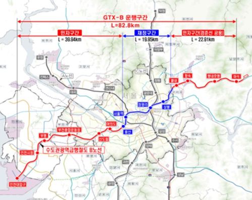 GTX-B는 송도국제도시(인천대입구역)∼인천시청역∼부평역∼부천종합운동장역∼신도림역∼용산역∼서울역∼청량리역∼남양주 마석 82.8km 구간에 건설될 예정이다.