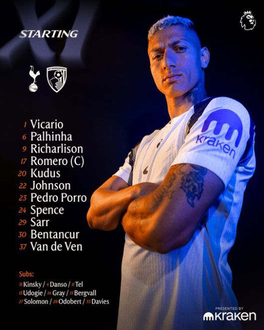 토트넘은 이날 경기에서 4-3-3 포메이션을 가동했다. 골문은 굴리엘모 비카리오가 지켰고, 수비진은 제드 스펜스, 미키 판더펜, 크리스티안 로메로, 페드로 포로가 구성했다. 중원에는 로드리고 벤탄쿠르, 주앙 팔리냐, 파페 마타르 사르가 배치됐고, 공격진은 브레넌 존슨, 히샬리송, 모하메드 쿠두스가 나섰다.