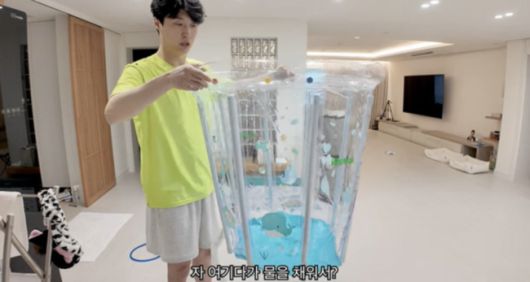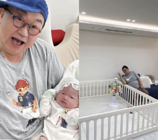 공개된 사진에는 널찍한 거실 한가운데 설치된 초대형 베이비룸이 자리 잡고 있었고, 이용식은 브이 포즈를 취하며 흐뭇한 미소를 지어 보였다.