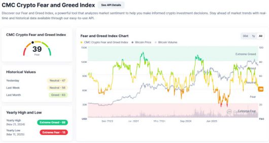 코인마켓캡의 ‘가상자산 공포 및 탐욕 지수’에 따른 가상자산 시장 심리 단계는 39점으로 ‘공포(Fear)’ 구간에 해당한다. 이 지수는 값이 제로(0)에 가까워지면 시장이 극도의 공포상태로 투자자들이 과매도를 하며, 100에 가까워지면 시장이 탐욕에 빠져 시장 조정 가능성이 있음을 뜻한다.
