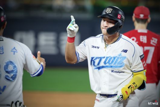 안현민이 적시타를 때려낸 뒤 세리머니를 펼치고 있다. 사진 | KT 위즈 |