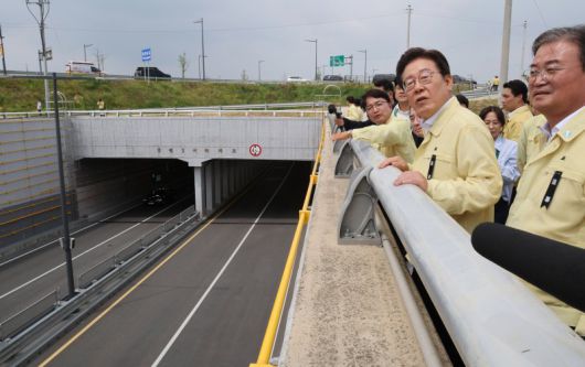 이재명 대통령이 7월 14일 충북 청주시 흥덕구 오송읍 궁평2지하차도를 방문해 안전시설 현황 점검을 하고 있다. 오송 지하차도 참사는 지난 2023년 7월15일 청주 흥덕구 오송읍 궁평2지하차도가 인근 미호강 범람으로 침수되면서 발생했다. 뉴시스.