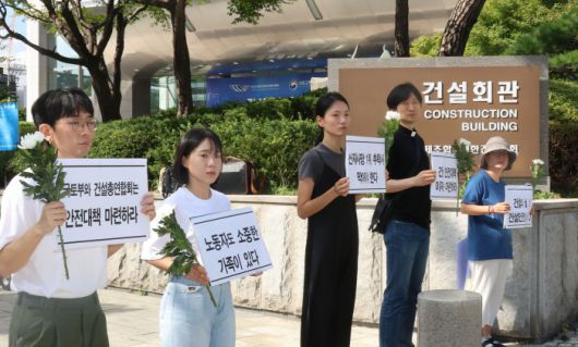 [서울=뉴스핌] 양윤모 기자 = 산업재해 유가족 등이 27일 오전 '2025 건설의 날' 기념식이 열리는 서울 강남구 건설회관 앞에서 손팻말 시위를 하고 있다. 2025.08.27 yym58@newspim.com |