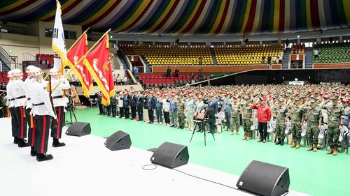 (제주=연합뉴스) 변지철 기자 = 제75주년 인천상륙작전 출정 기념 '제25회 제주 해병대의 날' 기념행사가 31일 제주시 한라체육관에서 열렸다.