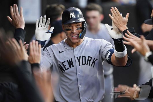 (서울=뉴스1) 이상철 기자 = 메이저리그(MLB) 뉴욕 양키스가 애런 저지의 시즌 42호포를 앞세워 27년 만에 원정 9연승을 질주했다.
