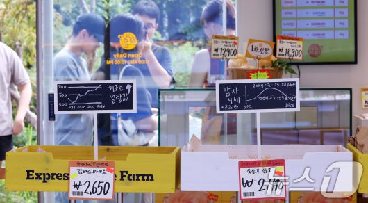 (서울=뉴스1) 박지혜 기자 = 31일 서울 성동구 글로우 성수에 연 경제유튜버 슈카의 ETF 베이커리 팝업 스토어 메뉴판에 재료 시세 그래프가 표시돼 있다. 'ETF 베이커리'는 소금빵, 베이글, 바게트, 식빵, 명란바게트, 단팥빵 등을 시중보다 훨씬 저렴하게 판매한다. 베이글, 소금빵, 바게트는 990원, 식빵 1990원, 명란바게트 2450원, 단팥빵 2930원으로 책정됐다. 우선 베이글, 소금빵, 바게트는 원자재 부담이 큰 다른 빵과 달리 버터·치즈 등 유제품과 계란이 거의 들어가지 않아 판매가를 대폭 낮출 수 있던 것으로 알려졌다. 2025.8.31/뉴스1