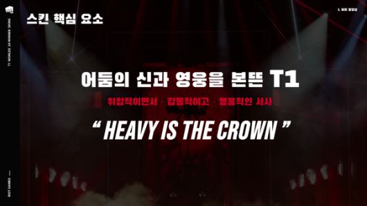 라이엇게임즈는 선수들의 요청을 받아들여 지난해 '월드 챔피언십'의 주제곡인 'Heavy is the Crown(왕관의 무게를 견뎌라)'를 스킨의 모티브로 삼았다. 또 유럽 판타지의 고딕 기사단을 콘셉트로 무거운 왕관과 갑옷을 착용한 모습을 스킨에 담았다.