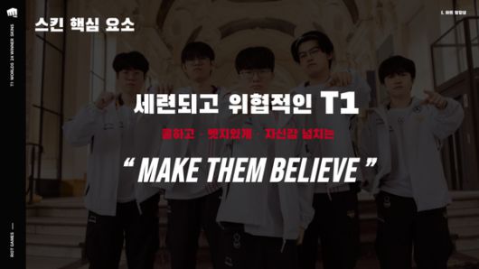 선수들과 논의 결과 T1의 우승 스킨은 어둡고 진지한 분위기 험난했던 챔피언의 길 디펜딩 챔피언의 중압감 신들의 전당 우아한 콘셉트의 디자인 톤으로 정해졌다.
