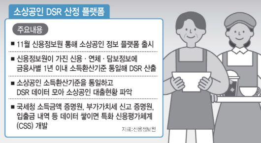 [이데일리 김나경 기자] 국내 730만 소상공인의 소득정보와 총부채원리금상환비율(DSR)을 모은 정보 플랫폼이 오는 11월 나온다. 제각각이던 소상공인 소득환산기준을 통일하고 DSR 데이터를 모아 소상공인 대출현황을 정확하게 파악하려는 조처다. 금융당국이 추진하는 소상공인 전용 신용평가시스템(SCB)에도 기반 데이터로 활용할 전망이다.
