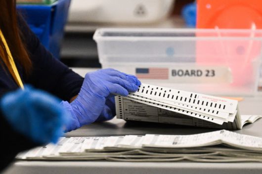 2024년 11월 5일 미국 애리조나주 피닉스에 위치한 마리코파 카운티 개표 및 선거센터(MCTEC)에서 선거 당일, 서로 다른 정당 소속의 선거관리 요원들이 서명 확인 절차를 마친 후, 투표용지가 들어 있는 우편투표 봉투를 개봉하고 있다.(사진= AFP) |