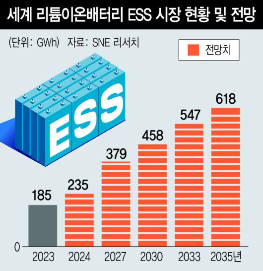 산업계는 미국 정부가 정책적으로 에너지저장장치를 지원하고 있는 부분에도 주목한다. 에너지 시장조사 기관인 에스엔이(SNE) 리서치 자료에 따르면 2023년 185기가와트시(GWh)였던 세계 리튬이온배터리 에너지저장장치 시장 규모는 2035년 618GWh까지 성장할 전망이다.