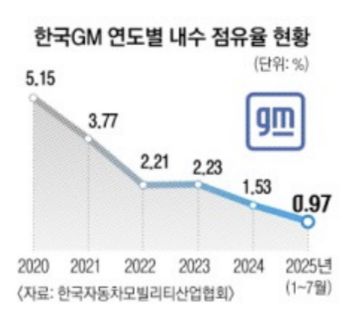 31일 한국자동차모빌리티산업협회(KAMA)에 따르면 올해 1~7월 국내 자동차 내수 판매가 지난해 같은 기간보다 3.7% 늘어난 96만 5131대를 기록한 가운데, 한국GM의 판매량은 지난해 같은 기간보다 40.3% 감소한 9340대에 그쳤다. 내수 시장 점유율은 0.97%에 불과해 이대로면 올해 연말까지 기준으로도 심리적 마지노선인 1%가 무너질 수 있다. 내수 판매 순위는 현대차, 기아, BMW, 메르세데스-벤츠, 르노코리아, 테슬라, KG모빌리티에 이은 8위다.