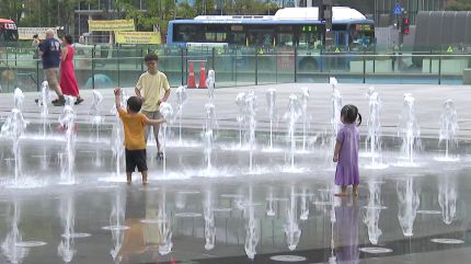 무더위에 지친 아이들은 광장에서 솟아나는 분수 사이에서 나올 생각이 없습니다.