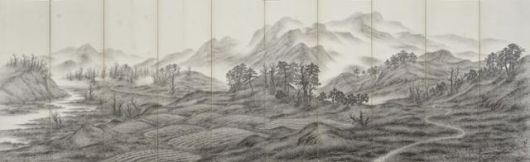 #. 산천이 옅은 안개에 파묻혀 드문드문 보인다. 먹이 부드럽게 퍼져 적막한 풍경을 감추고 서정적인 분위기를 살려 고향에 대한 정취를 부각한다. (이상범의 1945년작 '효천귀로')