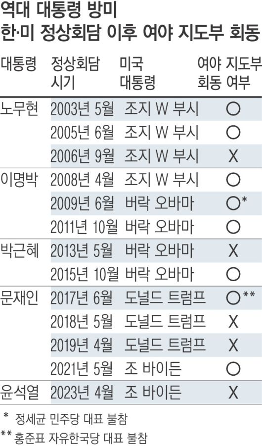 역대 대통령의 방미 정상회담 후 여야 지도부와의 회동 사례를 보면 이번에도 절충점을 찾아 회담이 성사될 가능성은 커 보인다. 경향신문이 2000년대 이후 취임한 대통령들의 사례를 살펴본 결과 노무현 전 대통령은 재임 중 총 3번의 방미 정상회담 이후 두 차례 여야 대표를 불러 회담 결과를 설명했다. 이명박 전 대통령은 세 차례 방미 정상회담 이후 3번 모두 여야 지도부와 회동했다. 박근혜 전 대통령은 재임 중 2번의 방미 정상회담 후 1번, 문재인 전 대통령은 4번의 한·미 정상회담 후 2번 여야 대표들과 만났다.