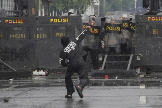 31일 인도네시아 자카르타 의회 인근에서 국회의원들의 주택수당에 항의하는 반정부 시위가 열린 가운데, 한 시민이 경찰을 향해 돌을 던지고 있다. AP연합뉴스 |