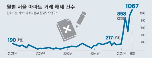 지난 4년간 월별 100건 안팎에 그쳤던 서울 아파트 매매계약 취소가 올해 상반기 급증해 지난 6월 1000건을 넘어선 것으로 집계됐다. 취소된 3건 중 1건은 계약 당시 최고가 거래였다. 급격히 늘어난 거래 취소가 최근 서울 아파트 가격 상승에 영향을 줬다는 분석이 나온다.